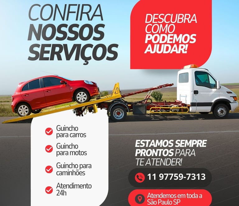 Somos referência em auto socorro em São Paulo, atuando com guincho para carros, motos, utilitários e veículos leves e pesados, garantindo transporte seguro em casos de pane mecânica, elétrica, acidentes ou remoção programada. Nosso guincho 24h perto de você está sempre disponível, inclusive em feriados e madrugadas.